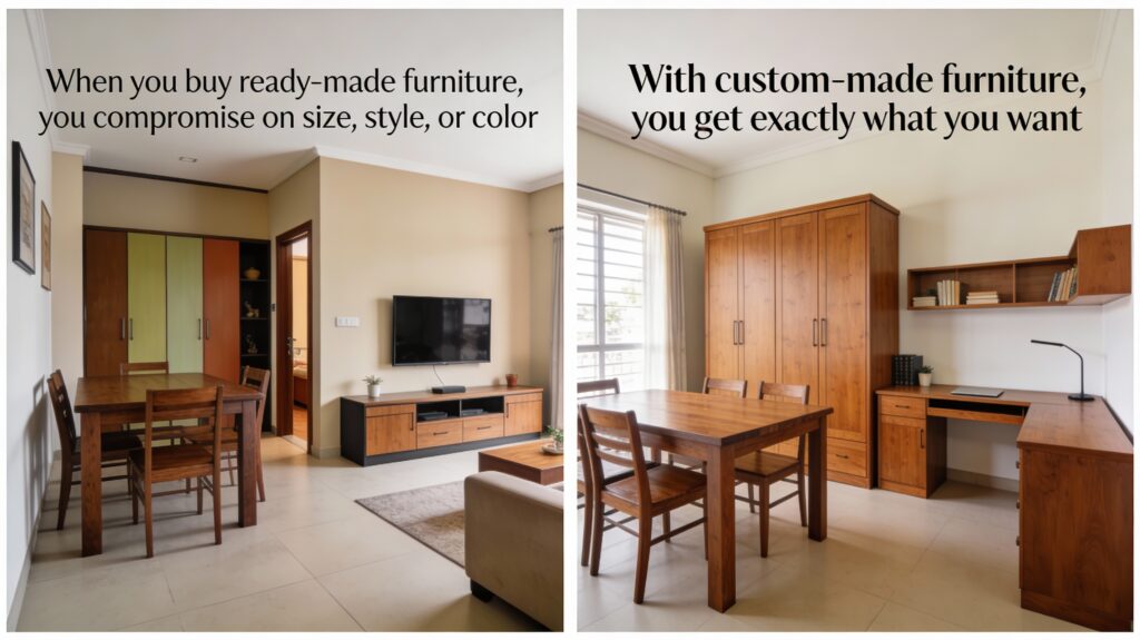When you buy ready-made furniture, you compromise on size, style, or color. With custom-made furniture, you get exactly what you want — dimensions that fit your space, finishes that match your interiors, and functionality that aligns with your lifestyle.