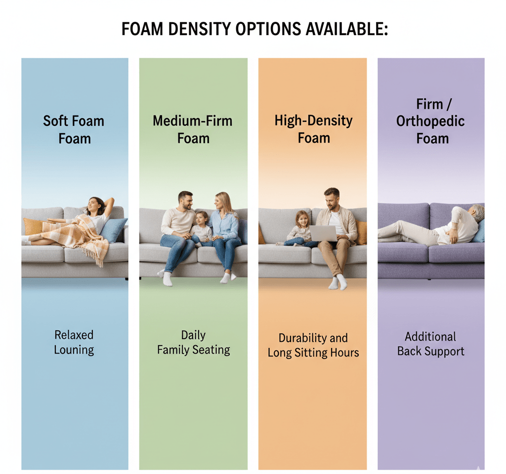Most factory-made sofas use low-density foam to reduce cost. This leads to sagging within a short period. Our custom furniture uses selected foam layers designed to maintain structure and comfort over time.
