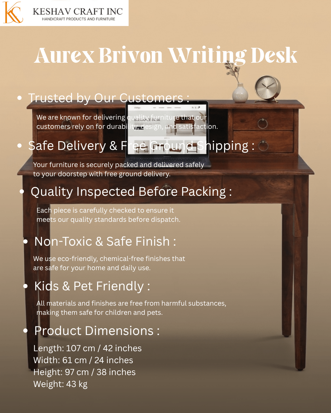 Its sturdy structure and balanced proportions ensure durability and comfort, while the classic design blends effortlessly into both modern and traditional settings. The Aurex Brivon Writing Desk is a perfect choice for creating a productive and organized workspace with a premium feel.