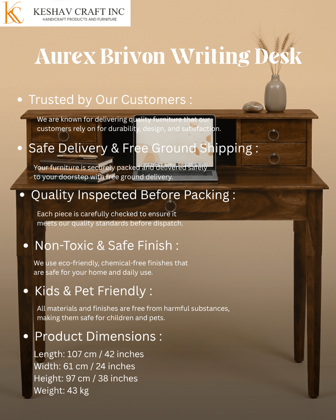 Its sturdy structure and balanced proportions ensure durability and comfort, while the classic design blends effortlessly into both modern and traditional settings. The Aurex Brivon Writing Desk is a perfect choice for creating a productive and organized workspace with a premium feel.