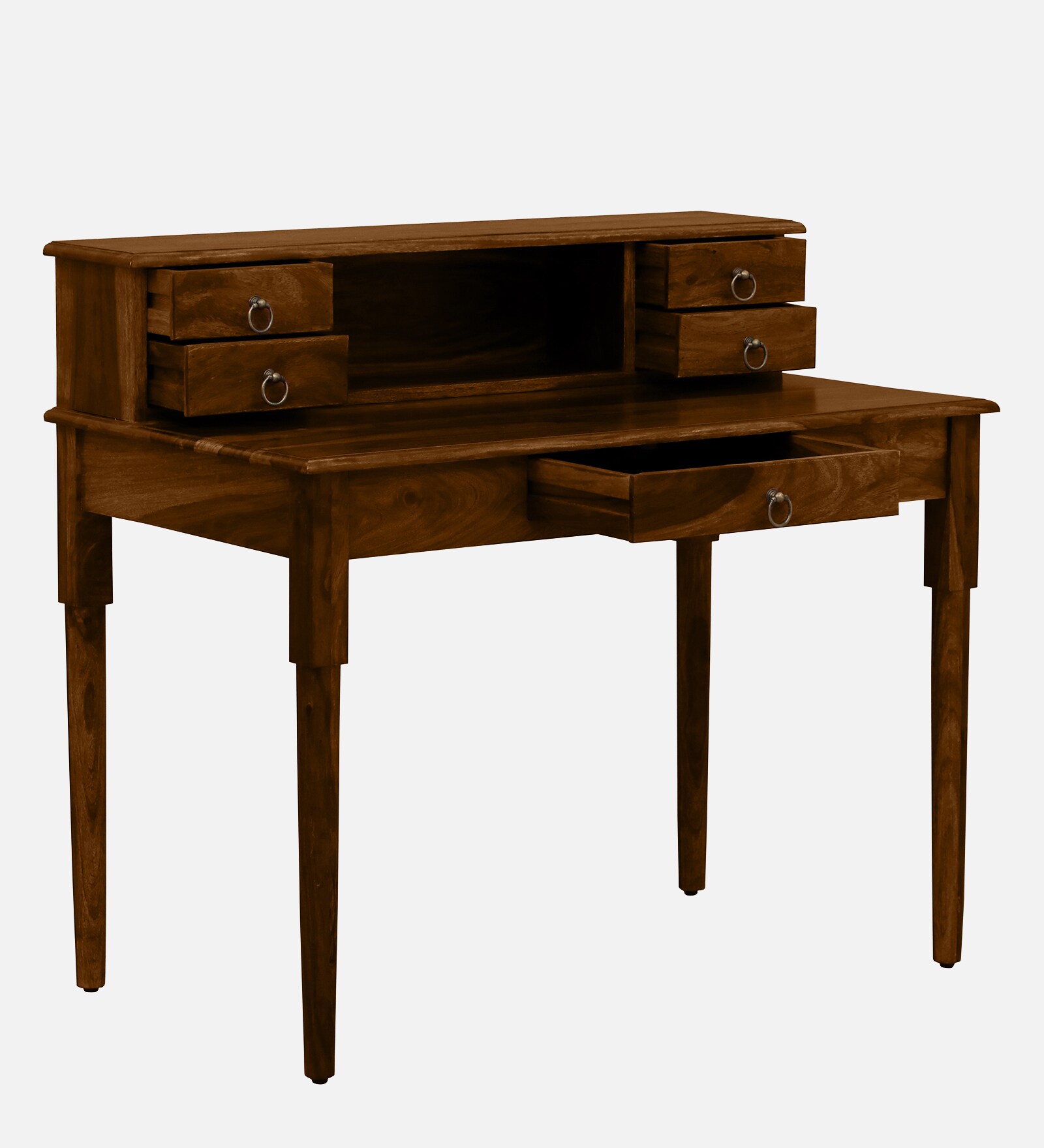 A premium Sheesham wood writing desk with multi-drawer storage and an upper organizer, designed for a refined and clutter-free workspace.