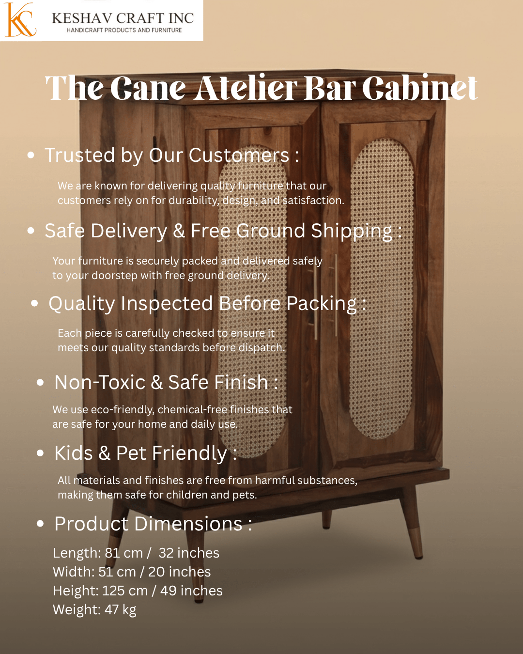 The Cane Atelier Bar Cabinet is a thoughtfully designed piece that combines artisanal detail with modern elegance. Crafted from solid wood, it showcases a rich natural grain enhanced by a smooth, warm finish. The cabinet doors feature intricately woven cane panels, introducing texture and a sense of lightness to the overall structure.