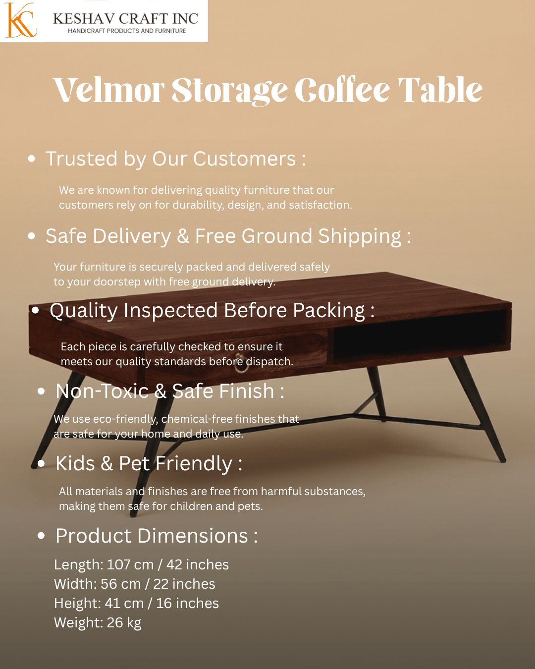 Elevate your living space with the Velmor Storage Coffee Table, crafted with rich wood textures and sleek metal legs. Designed for both style and function, it features built-in storage to keep your essentials organized while enhancing modern interiors.