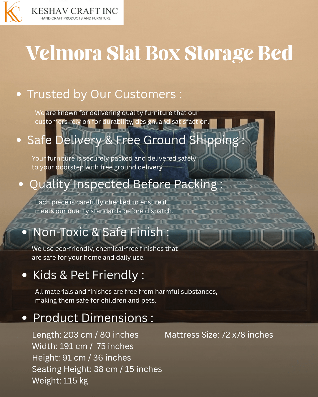 The Velmora Slat Storage Bed is crafted to bring together elegance and everyday functionality. Built from premium solid wood, it showcases a rich finish that highlights the natural beauty of the grain.