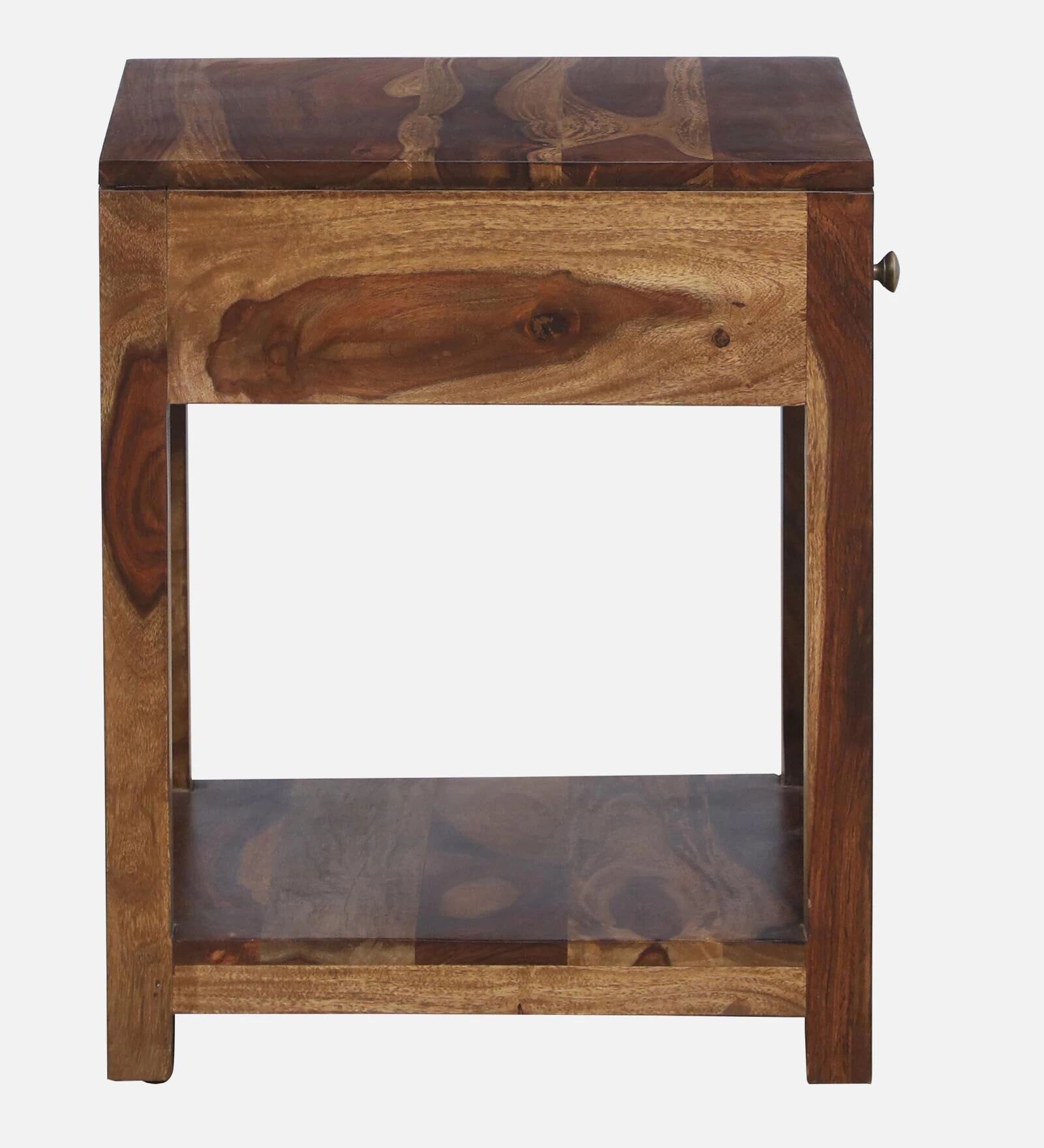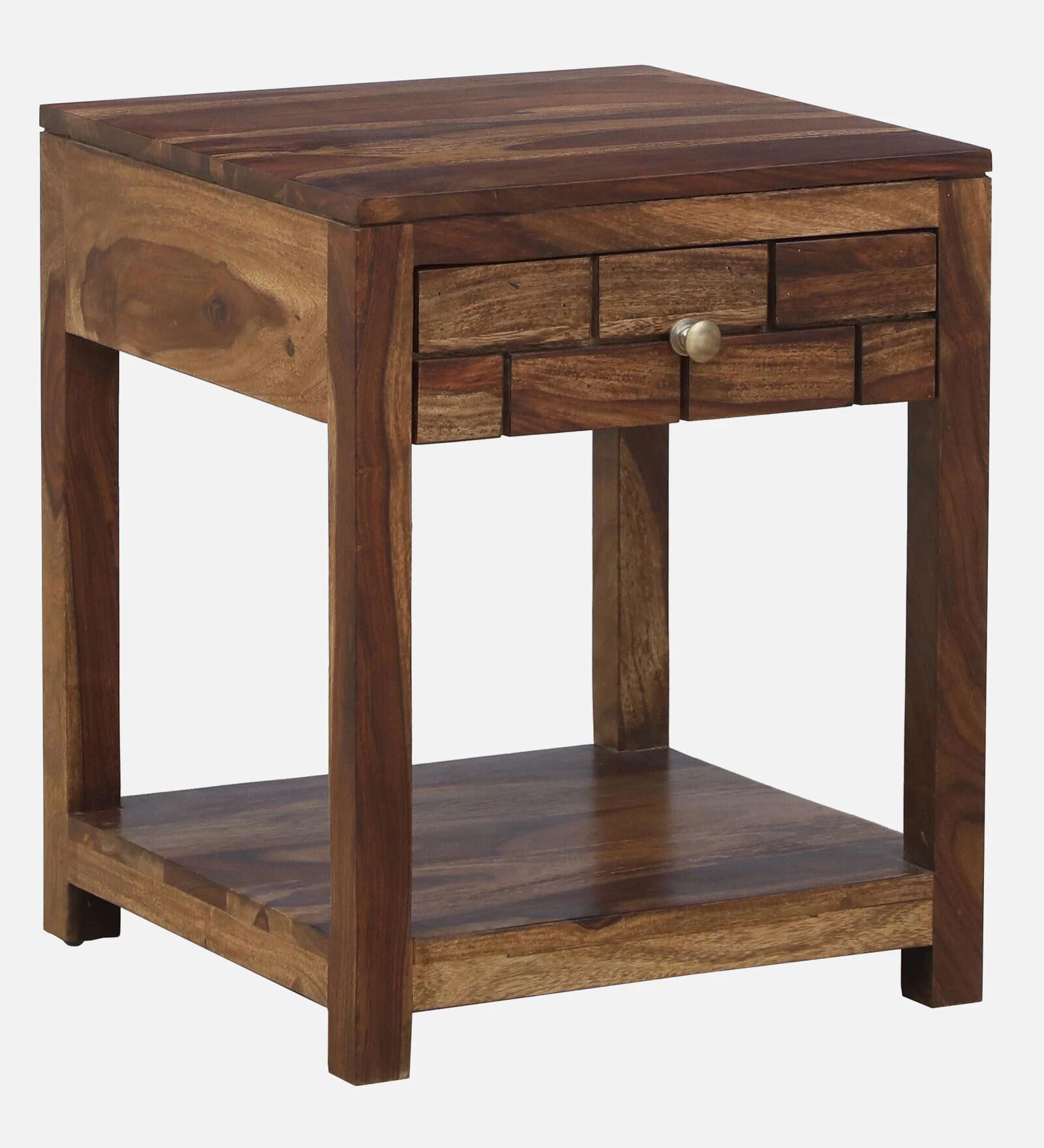 A stylish Sheesham wood side table with textured drawer design and open shelf.